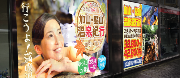 今月の一押し企画商品を大々的に大型掲示板で打ち出して、通行者を旅行に行きたい気分に導きましょう。