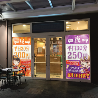 二階部分のガラス面を利用してキャッチコピー掲示板を掲示すると遠くからよく見えます。そこに大きな文字で掲示するだけで人目をひくことでしょう。