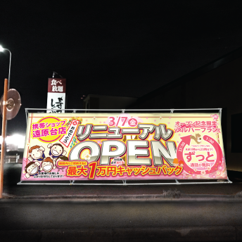 等お思いの方はいらっしゃいますか?キャッチコピー掲示板ではデザインもお願いできるので、お店の手間は届いた幕をただ貼るだけ。大きな広告掲示ができてしまいます。 |