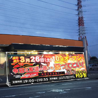 横幅4m程度のキャッチコピー掲示板を2・3台設置するだけでかなりの宣伝威力を発揮することでしょう。