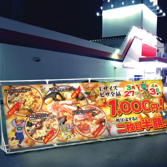 チラシを見逃していたお客様にもこれで売り込むことができますし、新聞を取っていないお客様も通り道に美味しそうなピザの画像の入った看板があれば帰りに一枚買って帰ろうかという気持ちにもなります。 |