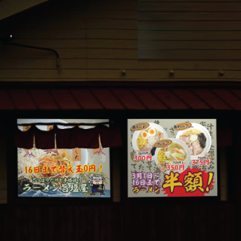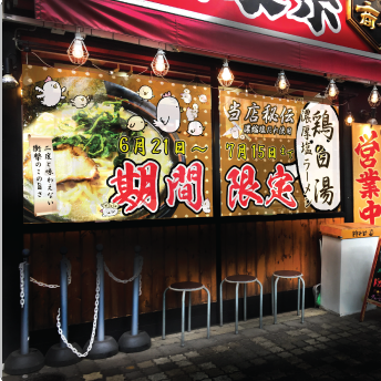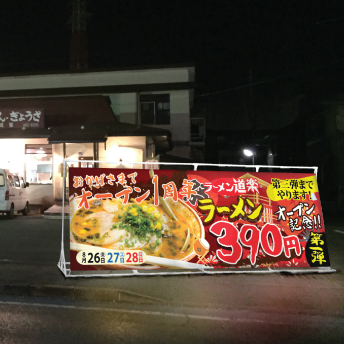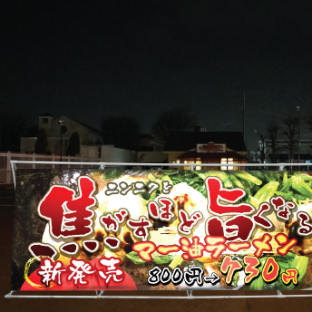 それが美味しそうな写真が載っていれば、注文したくなります。大型掲示板幕は横幅が約4mの大型掲示板なのでお客様の目にはラーメンがとても迫力があるように映ることでしょう。